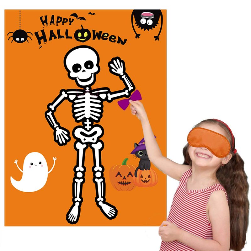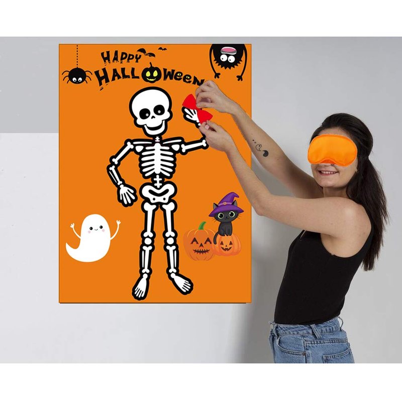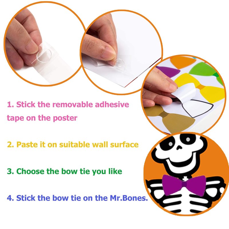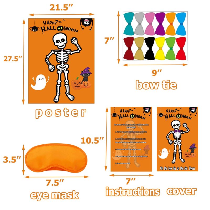 - PIN THE BOW TIE ON THE MR.BONES PACKAGE INCLUDED: 1 PCS Pin The Bow Tie on the Mr. Bones Game poster, 24 PCS colorful bow tie, 1 PCS orange eye mask, 1 PCS Pin the Bow Tie on the Mr. Bones Game instructions, 1 PCS Halloween pin game poster cover, 8 PCS dot glues. Perfect for Halloween Party Games, Halloween Party Decorations, Halloween Birthday Party, Classroom Party Game