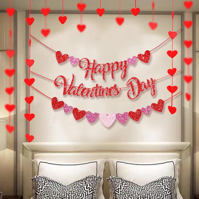- Package: 2x Happy Valentine’s Day letters banner, 1x red heart banner, red hanging heart garland decorations felt banner.