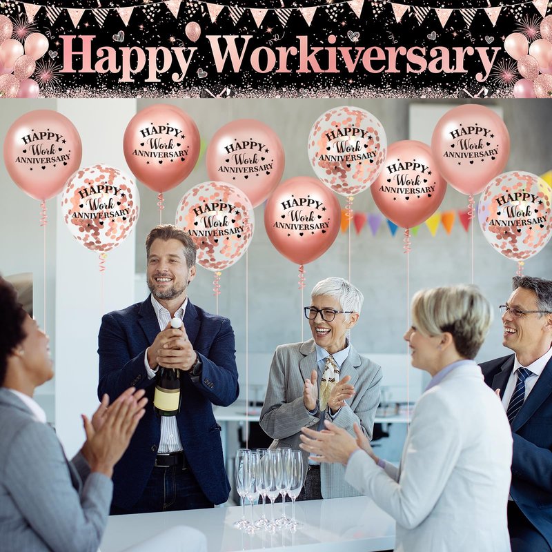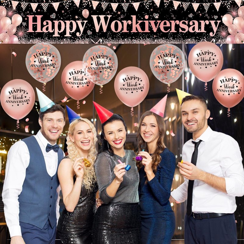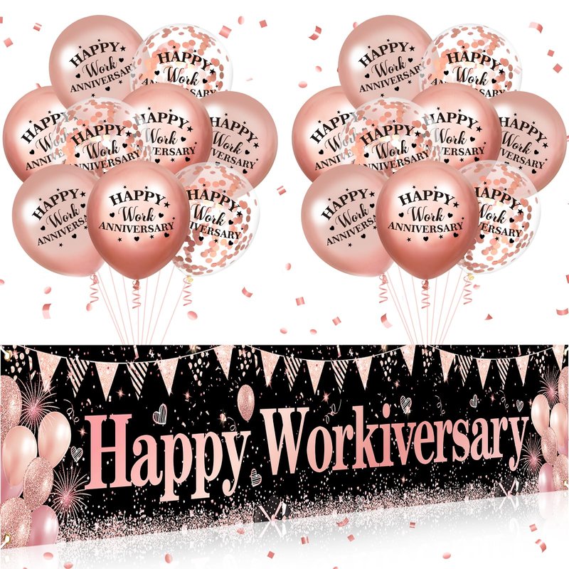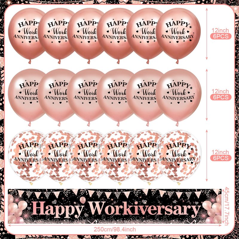 - 🎉Easy to Use: The Happy Work Anniversary banner comes with a long string and 4 copper buckles in the corners for your convenience, this rose gold Happy Work Anniversary balloons support air or helium. Notes: Please do not overfill the balloons and keep them away from heat or pointed object