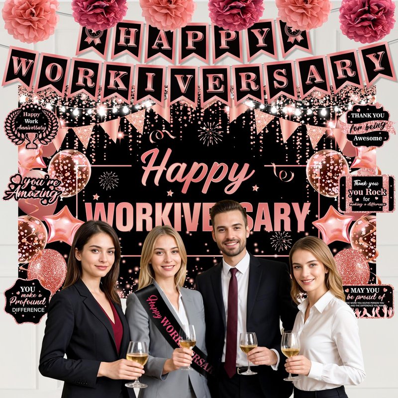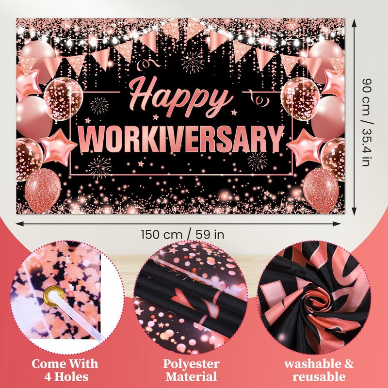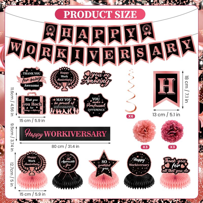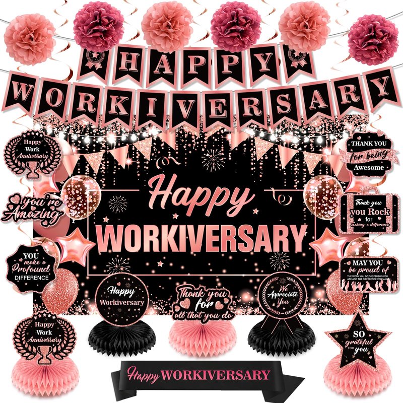 - Happy Workiversary Decorations Kit: This Workiversary Decorations set includes a rose gold and black "Happy Workiversary" pre-strung banners, a rose gold and black "Happy Workiversary" backdrop banner, 5pcs workiversary honeycomb centerpieces, 6 pcs tissue paper pompoms, 6pcs elegant hanging swirls and a special "Workiversary" sash.