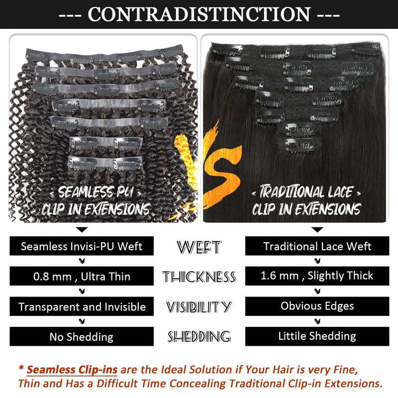 - 【New Technology Upgrade Clip In Hair Extensions】natural black ultra seamless clip in hair extensions human hair with 5mm width of the outer glue,it is not only more invisible & comfortable than normal clip ins human hair,but also super flat & ultra thin,which can fit your scalp perfectly.