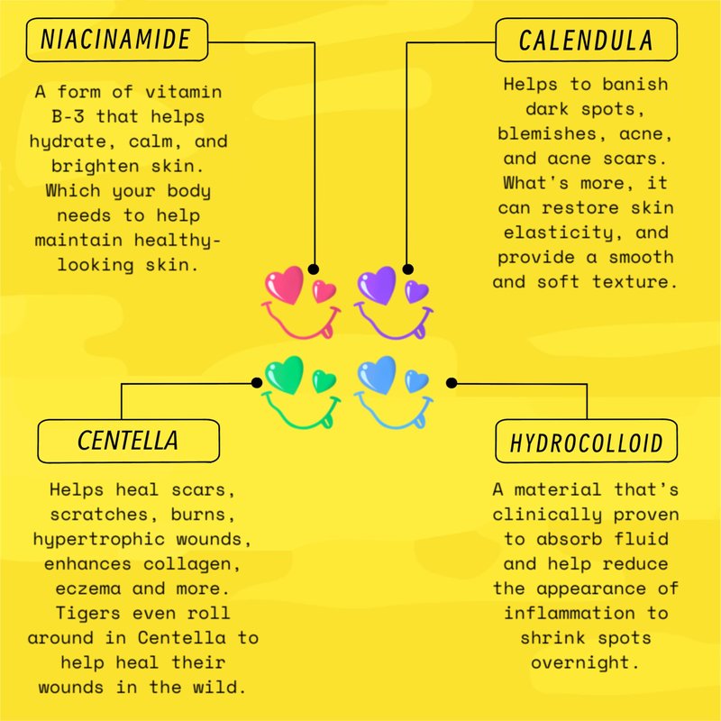 - HappyFace Rainbow Pimple Patches: Each patch is made with hydrocolloid, niacinamide, centella asiatica extract, calendula extract, tea tree oil, and other natural ingredients. They help absorb excess oil, reduce inflammation, and promote healing.