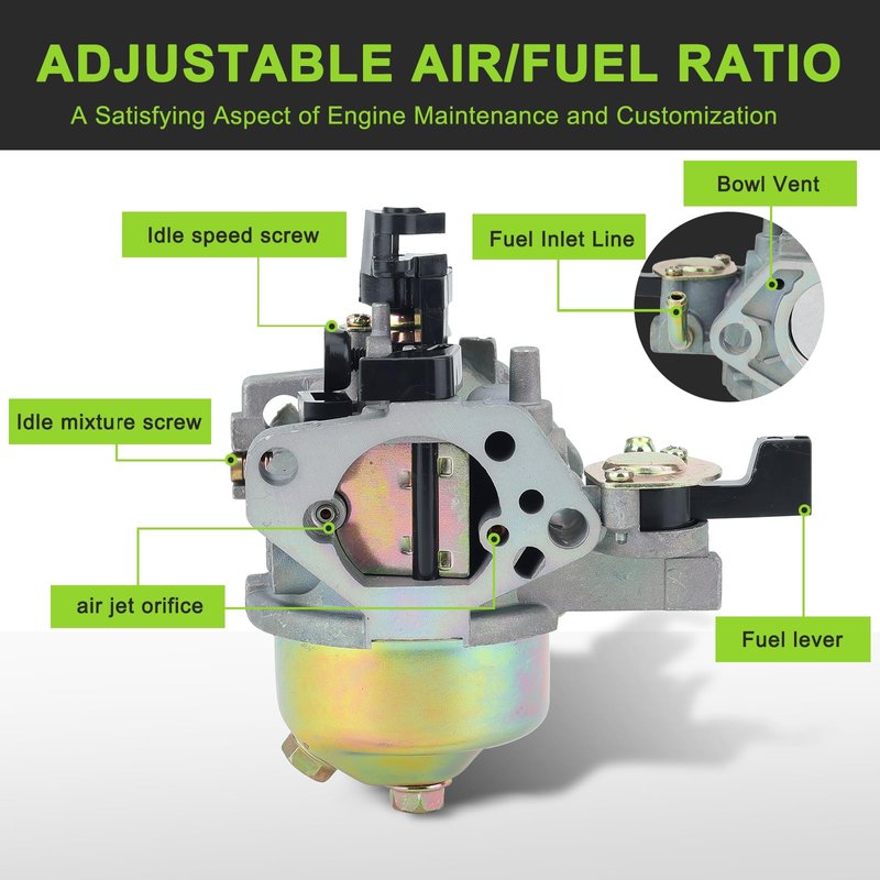 - [PREMIUM MATERIAL FOR PREMIUM CARBURETOR] Resistant to chemical corrosion, high temperature, and wear by utilizing brass components, zinc plated float bowl, high-density plastic float, and anodized aluminum carburetor body.