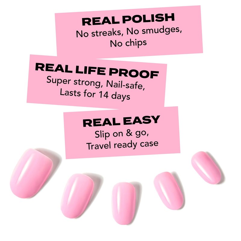 - REAL POLISH No streaks, no smudges, no chips. Reusable nails made from 100% PCR. Salon quality color and gel shine finish.
