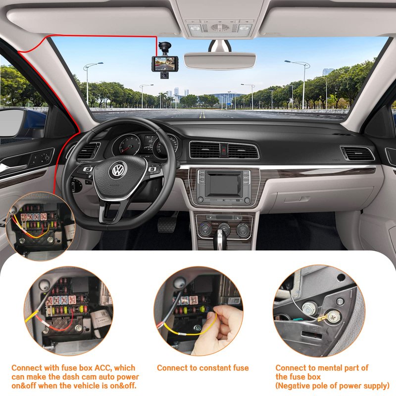 - 【24 Hours Parking Surveillance】The Mini USB vehicle hardwire kit connected to car battery or fuse box power, can uninterruptedly supply power for dash camera 24 hours parking surveillance. The dash cam switches to parking surveillance mode automatically when your turn off the car engine, and switches back to normal recording when on.