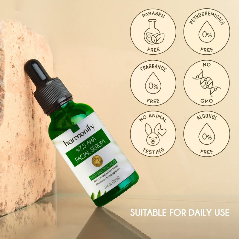 - Infused with 7.5% AHA (Alpha Hydroxy Acid) enriched with Salicylic Acid, this serum exfoliates and purifies the skin, leaving it fresh and revitalized. Each bottle contains ¾ oz (20 ml) of this potent solution, packed with ingredients that deliver remarkable results.