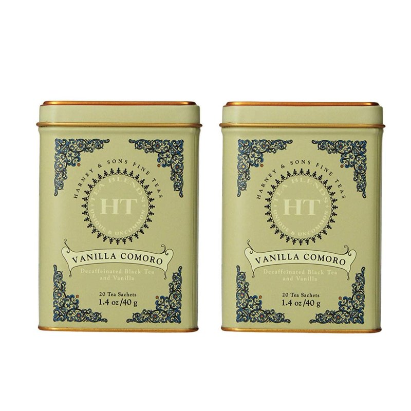 Harney & Son's Vanilla Comoro Tea Tin 20 Sachets (1.4 oz ea, Two Pack) - Decaf Black Tea Blend with Vanilla - 2 Pack 20ct Sachet Tins (40 Sachets)