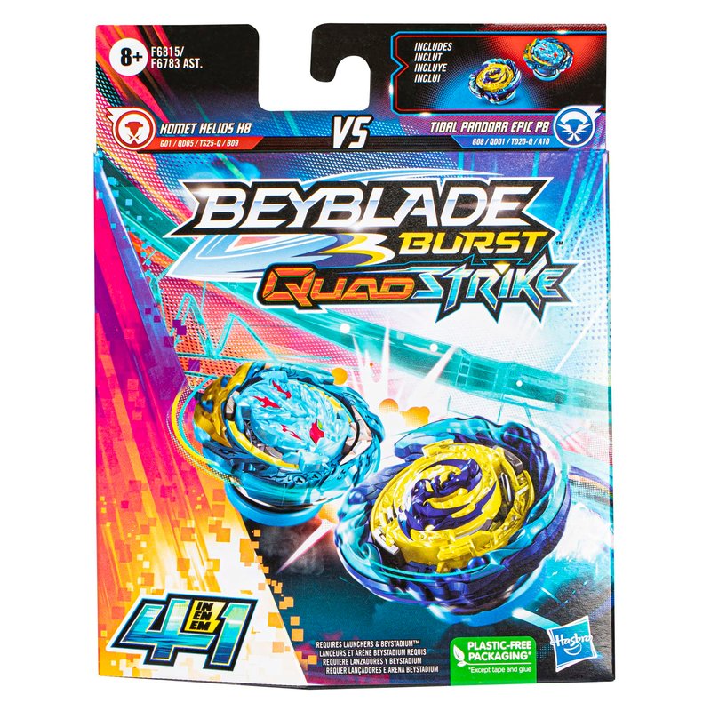 - 2 CUSTOMIZABLE TOPS: Includes Beyblade Burst QuadStrike left-spin Komet Helios H8 G01 QD05 TS25-Q B09 and right-spin Tidal Pandora Epic P8 G08 QD01 TD20-Q A10. Customize top to Core and Apex mode or to Core+ and Apex+ mode to change top type