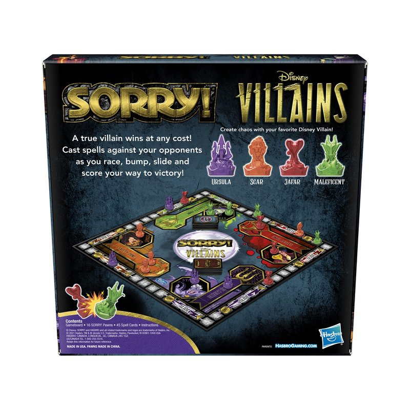 - SORRY GAMEPLAY WITH A DISNEY VILLAINS TWIST: This family game combines classic Sorry gameplay with a wickedly fun Disney Villains inspired gameboard, Spell cards, and Villain pawns