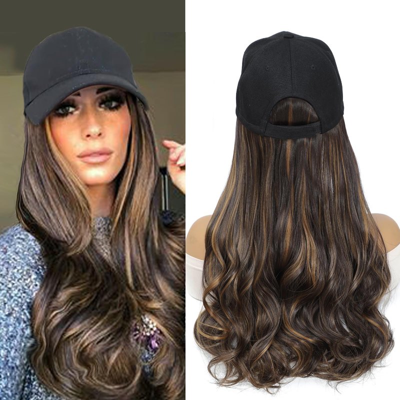 Hat Wig Baseball Cap With Long Wavy Ends Straight Hair Extensions Attached Heat Resistant Synthetic Fiber Hairpiece Replacement Wigs in Hat for Woman Girls Mix brown color(Mlight brown, 18inch)