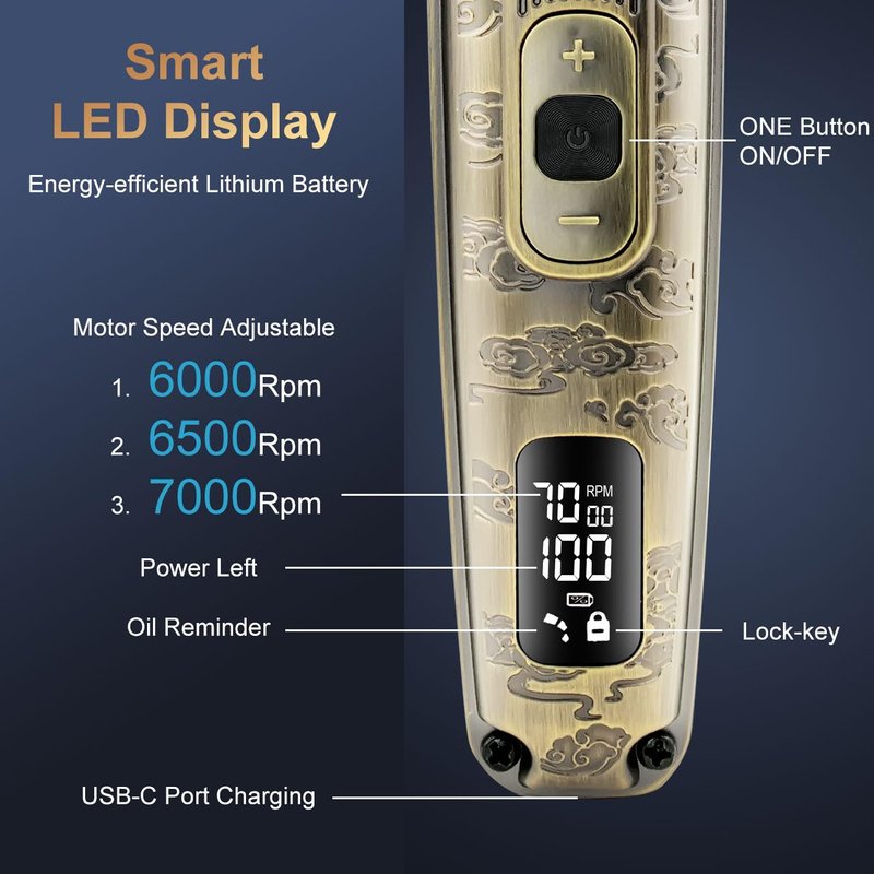 - 【Up to 7000 RPM Adjustable Speed】Resistant motor with a standard speed of 6000 RPM, which can be increased to 7000 RPM in the speed control mode for cutting harder hair or fast trimming, and ensuring a neat and straight edge . The motor stands up to frequent use, runs smoothly, delivers a trimming without pulling or snagging,and is less prone to overheating and wear.