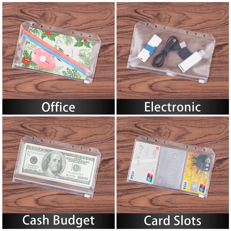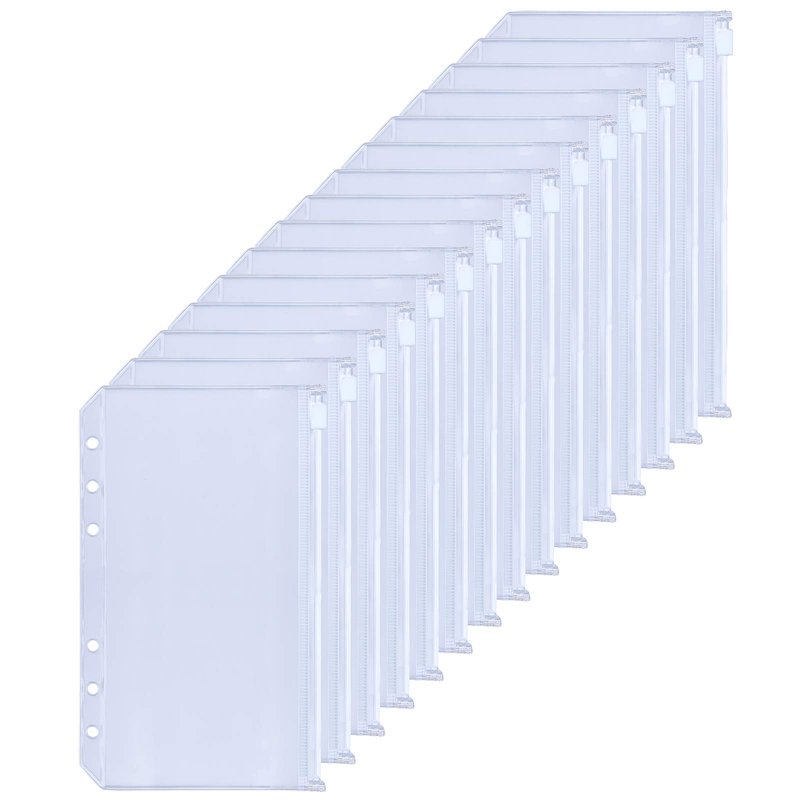 HAUTOCO 15PCS A6 Binder Pockets Clear PVC 6-Holes Binder Envelopes Zipper Binder Pouches for A6 Notebook Binder, Cash Envelopes for Budgeting, Waterproof Zipper Budget Envelopes Loose Leaf Bags