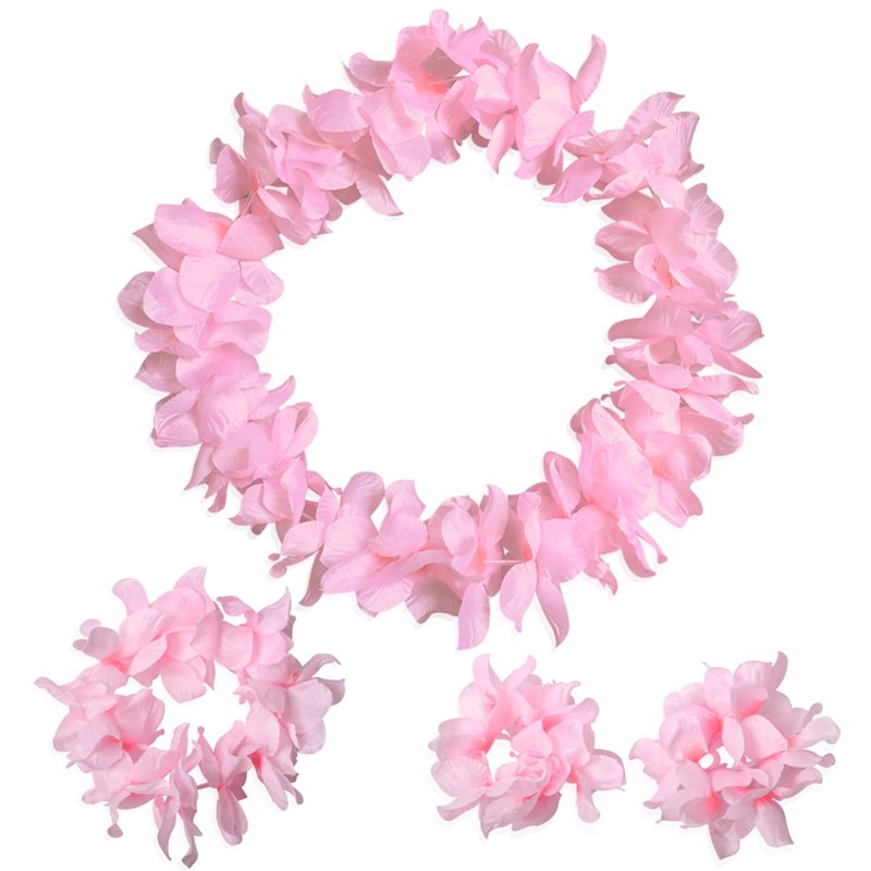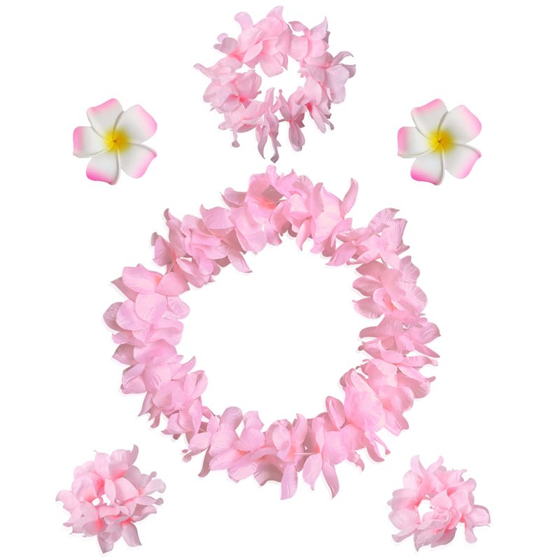 Package: 1 pc hawaiian leis + 1 pc headband + 2 pcs bracelets + 2 pcs plumeria hair clips