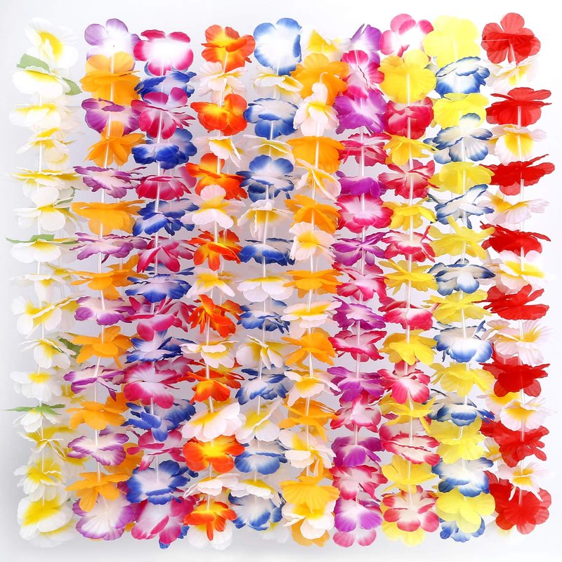 - Soft,Durable & Safety Material - The Hawaiian leis are made of soft and odorless polyester fabric. Each flower garland with multi-color and vibrant floral design, and with a small plastic pipe separately, the Hawaiian flower leis will offer super great protection and comfortable fit for any age group.