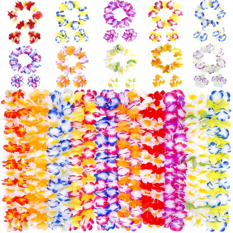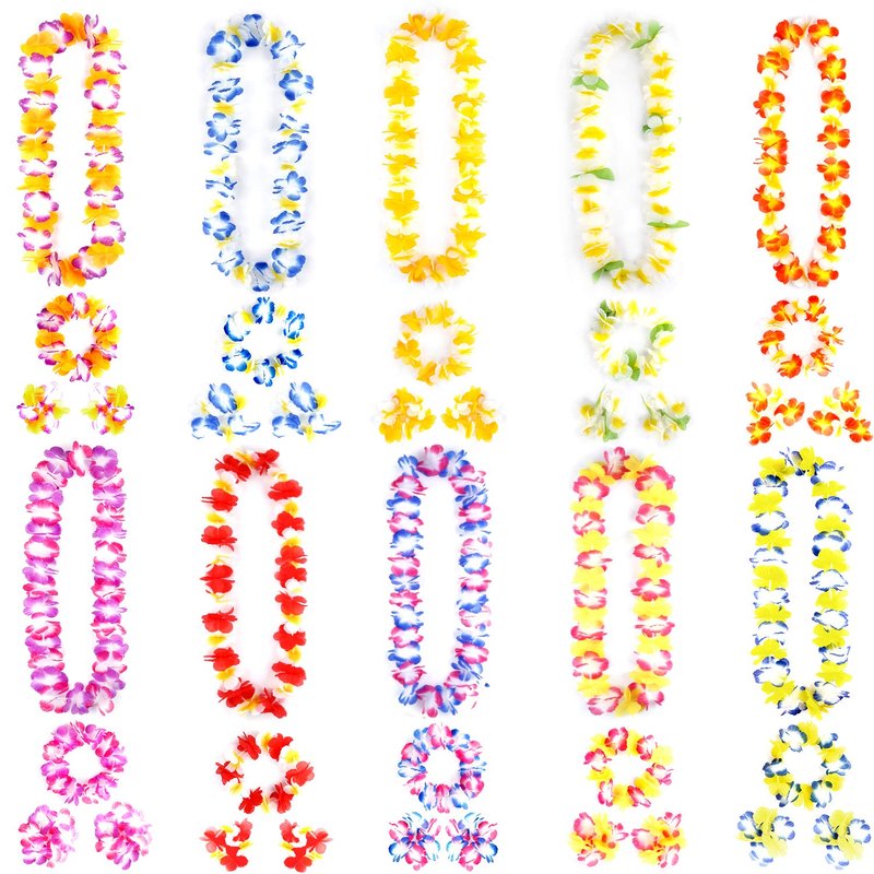 - Hawaiian Luau Party Supplies Set - 10 pieces elastic necklaces, 10 pieces headband and 20 pieces wristband. A must have for any luau themed party,wedding floral leis, and much more.