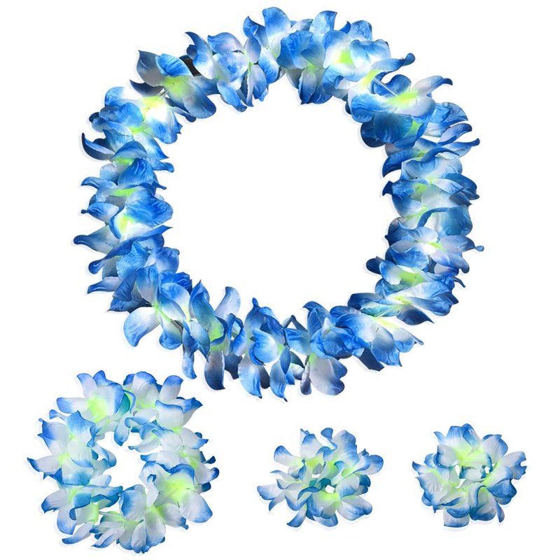Hawaiian Leis Luau Tropical Headband Flower Crown Wreath Headpiece Wristbands Women Thicker Necklace Bracelets Hair Band For Summer Beach Vacation Pool Party Decorations Favors Supplies Set Blue