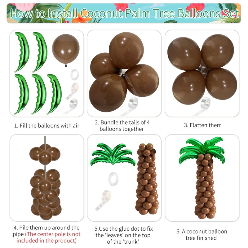 - Special Palm Tree Coconut Balloon Set -- Foil balloons shaped like real palm leaves and brown latex balloons in the same color as coconuts, lifelike and cute, enough to easily make a giant coconut tree. The set also includes table skirts, straws, cupcake toppers, hibiscus flowers, and palm leaves for creating a tropical seaside atmosphere!