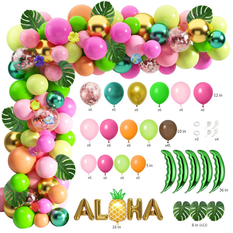 - Multicolor Luau Balloon Arch Garland Kit -- Made of natural latex and quality aluminum film, reusable, not easy to break, non-toxic and eco-friendly. We have 9 colors and 12/10/5 inches sizes of latex balloons for you to choose. Adding aloha foil balloons that your balloon arch will more eye-catching and colorful. (Simply blow up the balloons to about 80% for optimal performance.)