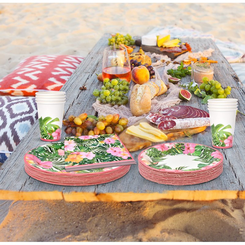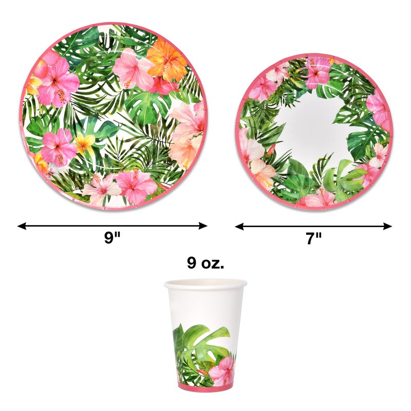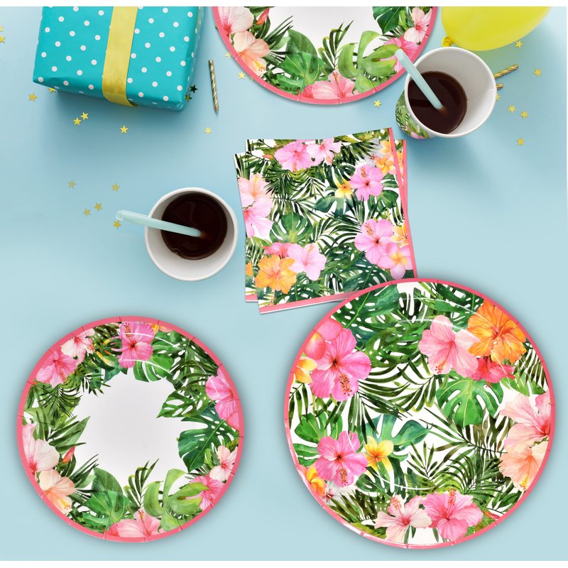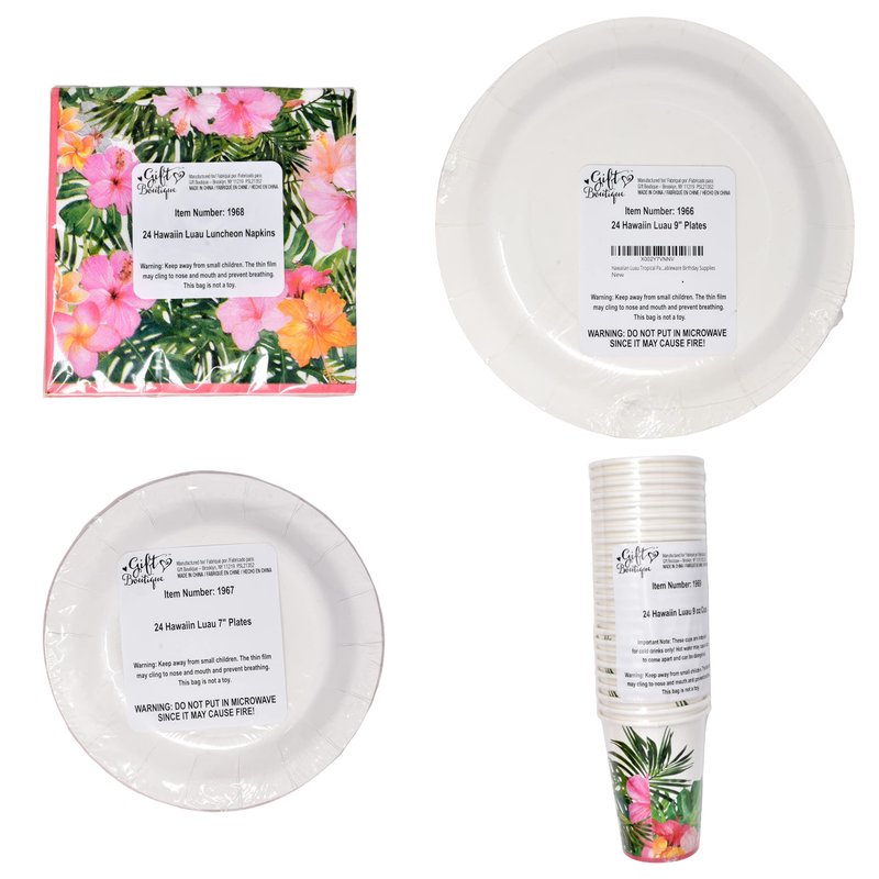 - Hawaiian Luau Party Set Serves 24: Gift Boutique Luau party set includes 24 9” Dinner Plates featuring palm leaves and hibiscus flowers scattered around on a white background with a pink border around and 24 Luncheon Napkins coordinating. The 24 7” Dessert Plates features scattered palm leaves and hibiscus flowers and a green border around and 24 9 oz. cups coordinating.