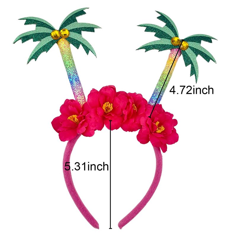 - Hawaiian Head Decoration: The hair hoop is decorated with two palm trees, as being on the beach. The red flowers stuck on the headband make it more special and beautiful.