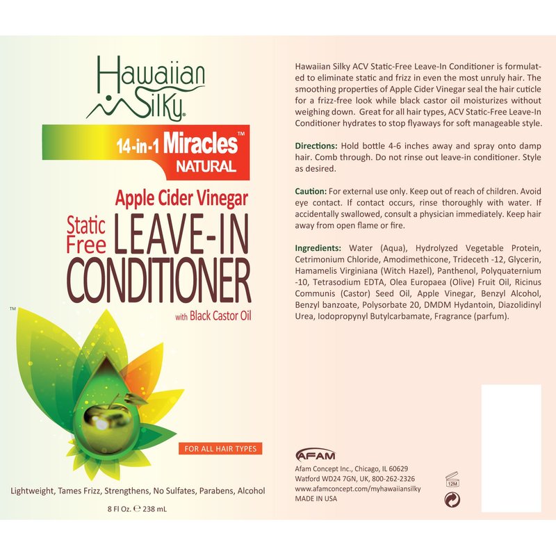 Hawaiian Silky Static-Free Apple Cider Vinegar Leave-in Conditioner, 8 fl oz - Black Castor Oil Extract for Hair Growth - Natural Treatment Men, Women & Kids - Good on Color Treated Scalp