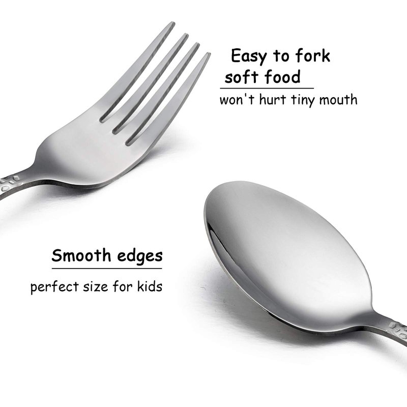 - ✅ PERFECT SIZE (^ᴗ^) - Customized mini size to fit toddler’s hand and mouth, Hammered pattern gives a shiny glow to catch toddlers’ attention, Proper thin fork tines make it easy for kids fork soft food by themselves, suggest for 24 months +