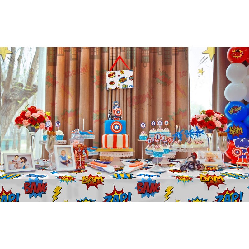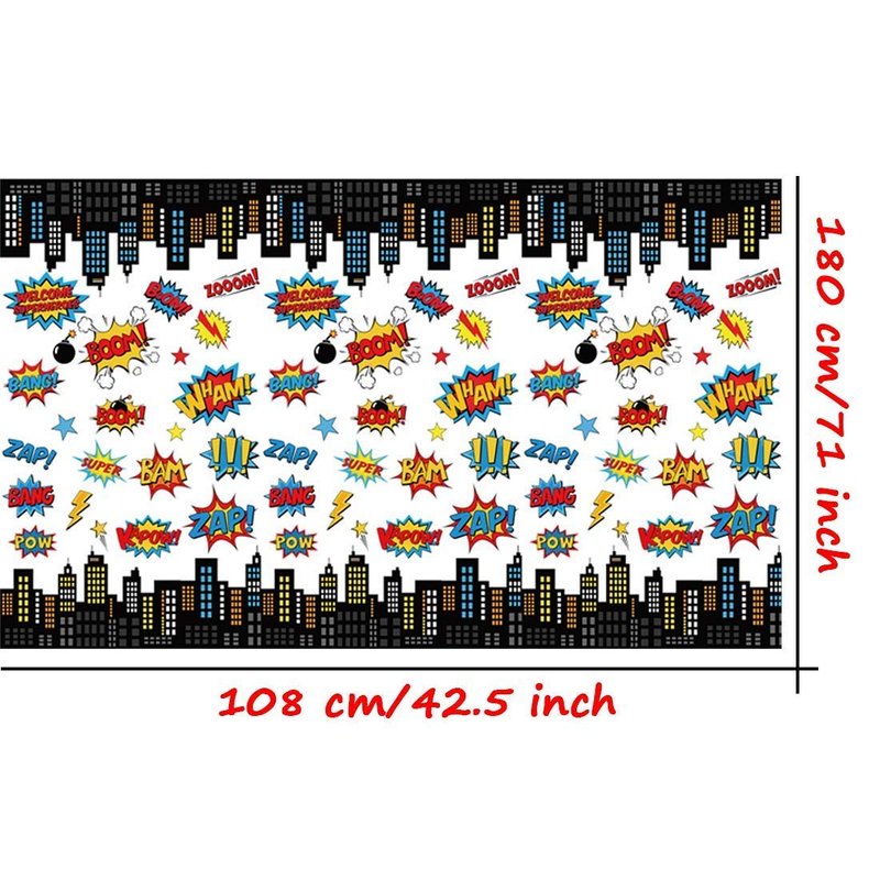- FUN PARTY TABLECLOTH - Protect your table and seat your super heroes around our strong plastic superhero table cover. our plastic table cloth can be used outside or in, and has a superhero cityscape backdrop design to keep your little ones engaged in the superhero theme.