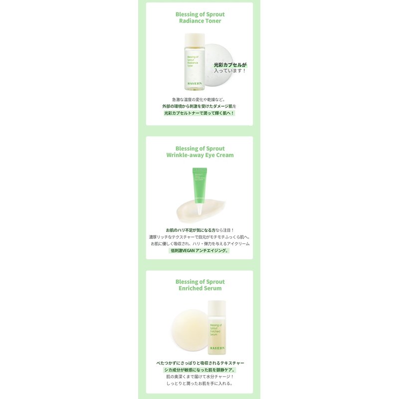 - EYE'S LUMINOUS CHARM. Experience rejuvenation with the HAYEJIN Blessing of Sprout Wrinkle-Away Eye Cream. Fortified with botanical proteins and a nourishing sprout complex, this gem from the facial kit targets the delicate eye area restoring vitality and a youthful glow.