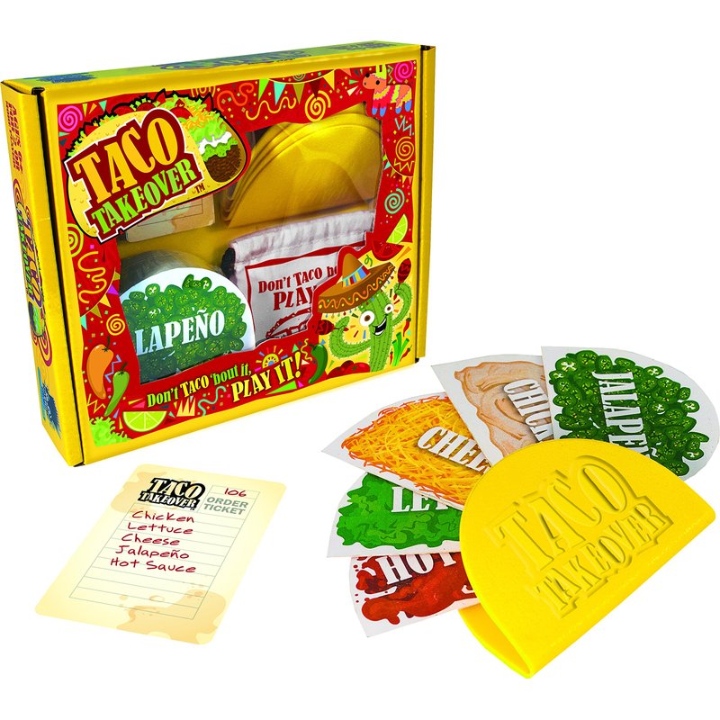- 4 plastic taco shells, 75 topping cards, 20 order tickets, 1 cloth storage bag, Easy-to-follow instructions