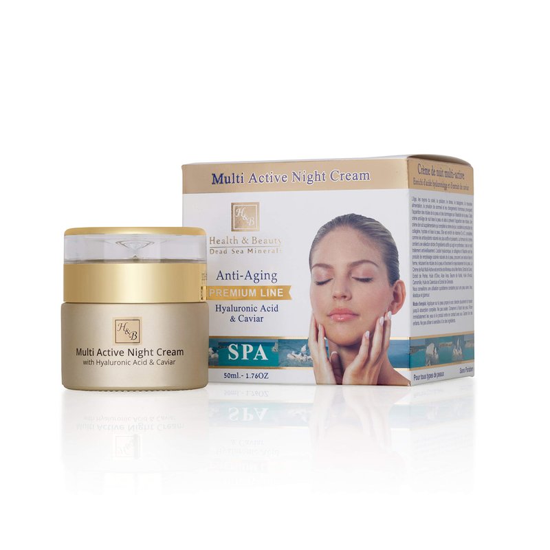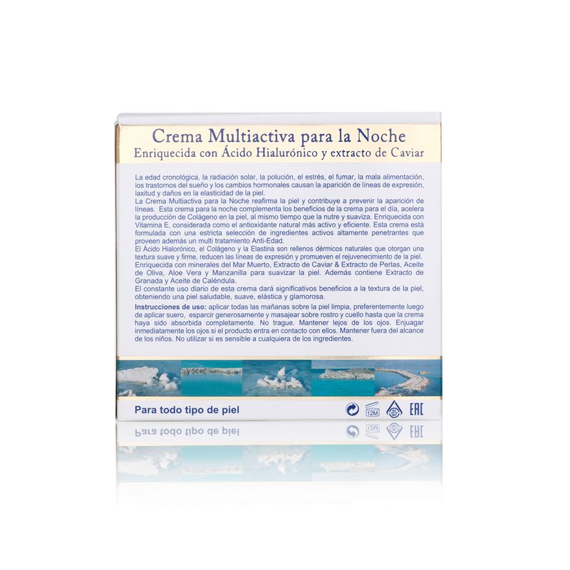 The multi-active night cream contains an advanced anti-aging formula. Dead Sea Minerals, Caviar extract, Pearl extract, Olive oil, Aloe Vera, Chamomile, Pomegranate extract and Calendula oil work deep beneath the skin surface to nourish and hydrate.