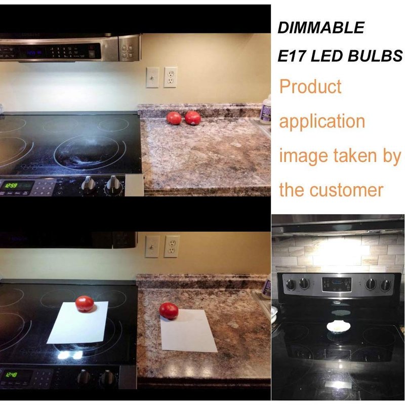 E17 bulb is designed to be used under the microwave to light the stove/counter (get some decent lighting while cooking) and any other appliance type sockets that are E-17 connector type. Please note this LED bulb is powered by AC 110-130V circuit. It uses the powerful 52pcs cooper bracket and gold-line packaging 2835SMD LEDs to emit the comfortable lighting. It's a cost-saving item to run with only 4W of power for up to 360lumens. Last a lot longer at a lower energy cost. Save effort and maintenance costs on changing bulbs frequently. The E17 bulb has a viewing angle of 360 degrees. It fits the halogen socket as a perfect replacement that produces less heat and an equivalent amount of light.