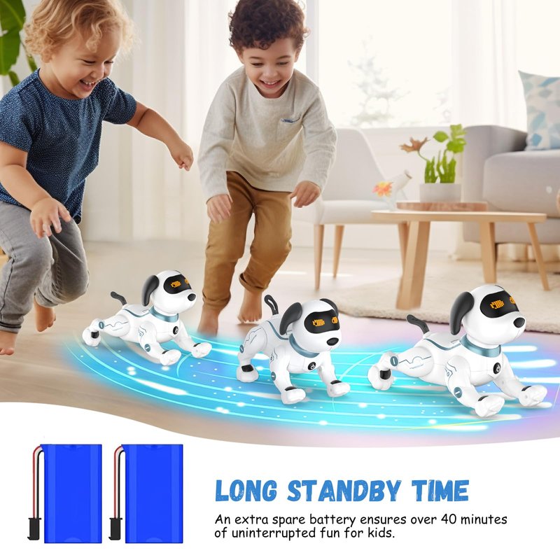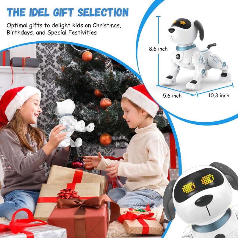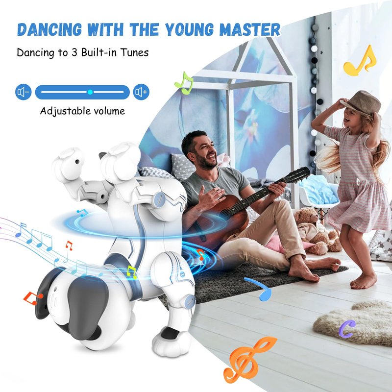 - 🌻[Intelligent & Interactive Robotic Puppy] Touch the chin of the walking dog to perform a cute gesture and makes a sound and interacts with you. You can program the actions as you like through the remote control and then the dog will follow the commands. The dog toys for kids have 3 set of dance routines and dances along music. Perfect robot pets for both boys and girls.