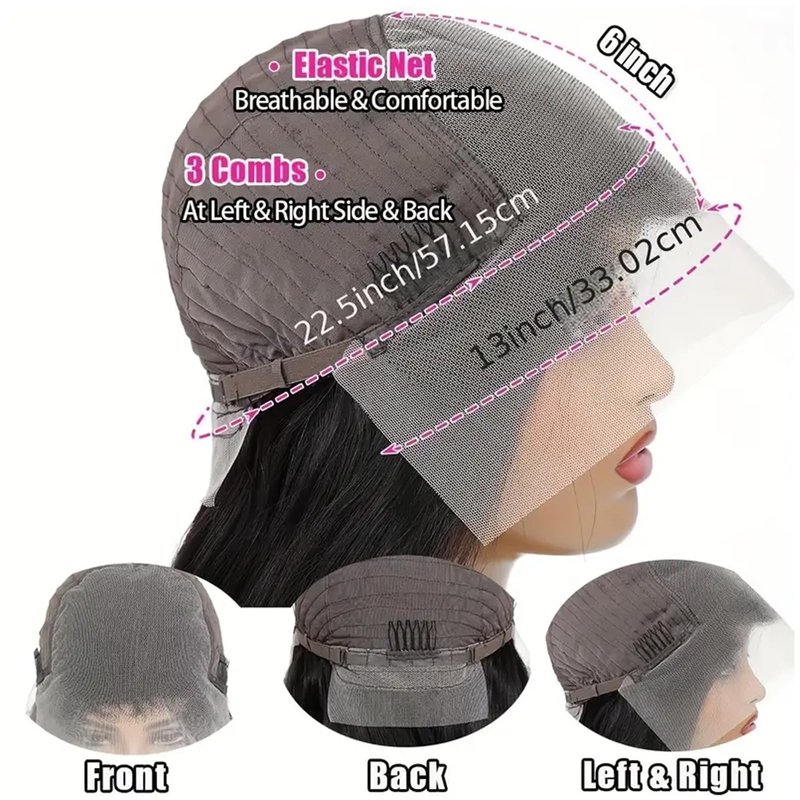 - 13x6 Frontal Wig Cap Size: 22.5 Inch Medium Cap with 4 Combs and Adjustable Straps Make It Fit Most People. Breathable & Durable Lace Material Make It More Comfortable.