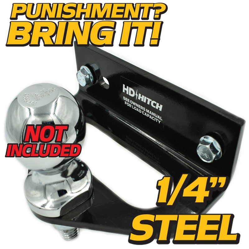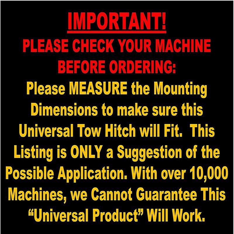 Super Heavy Duty 1/4" Thick Steel Tow Hitch. PLEASE CHECK MACHINE FOR MOUNTING COMPATIBILITY RETURNS HAVE A 20% RESTOCKING FEE AND CUSTOMER PAYS RETURN SHIPPING SO PLEASE CHECK BEFORE ORDERING.