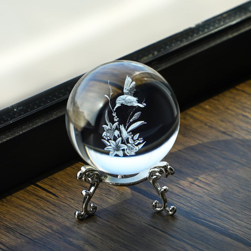 HDCRYSTALGIFTS 3D Hummingbird Crystal Ball Paperweight 60mm(2.3Inch) Laser Engraved Glass Sphere Display Globe Meditation Ball Home Decor with Metal Stand