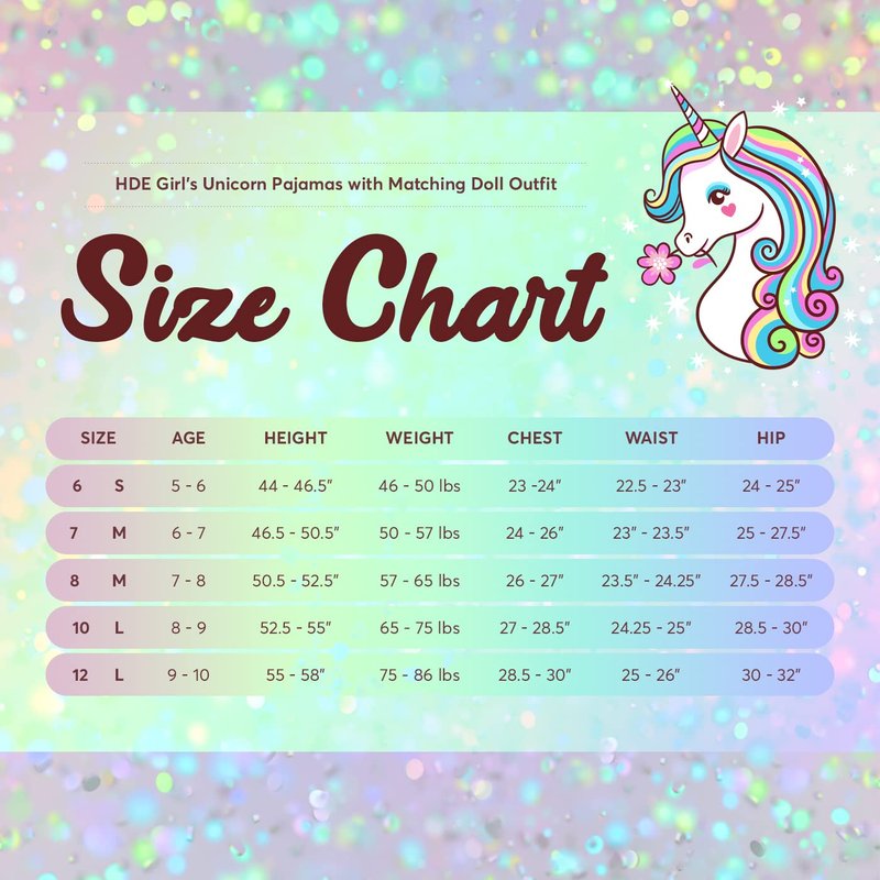 - Your little princess will look gorgeous in this girly pajama set for children with adorable unicorn patterns, vibrant colors and cute matching prints on the pants that will make your little girl shine. Doll NOT included