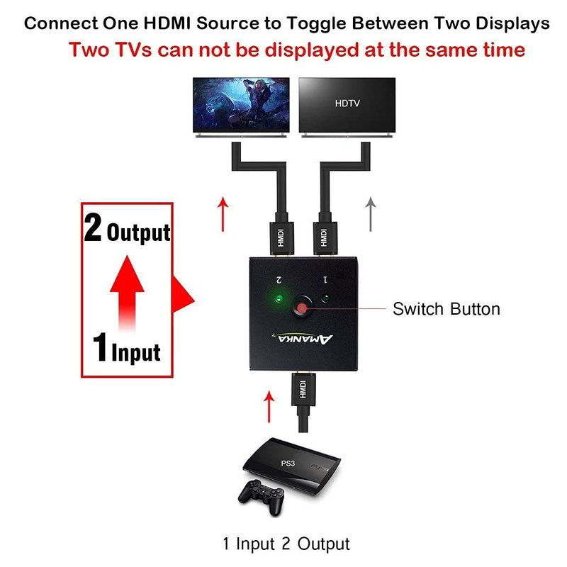 - 【Plug and Play,No driver】just simply press the button on the HDMI box to make shift of input or output source. With 2 LED indicators, you can easily tell which connected HDMI device is running.Lifetime Tech Support through Amanka Direct Customer Support
