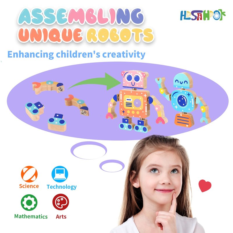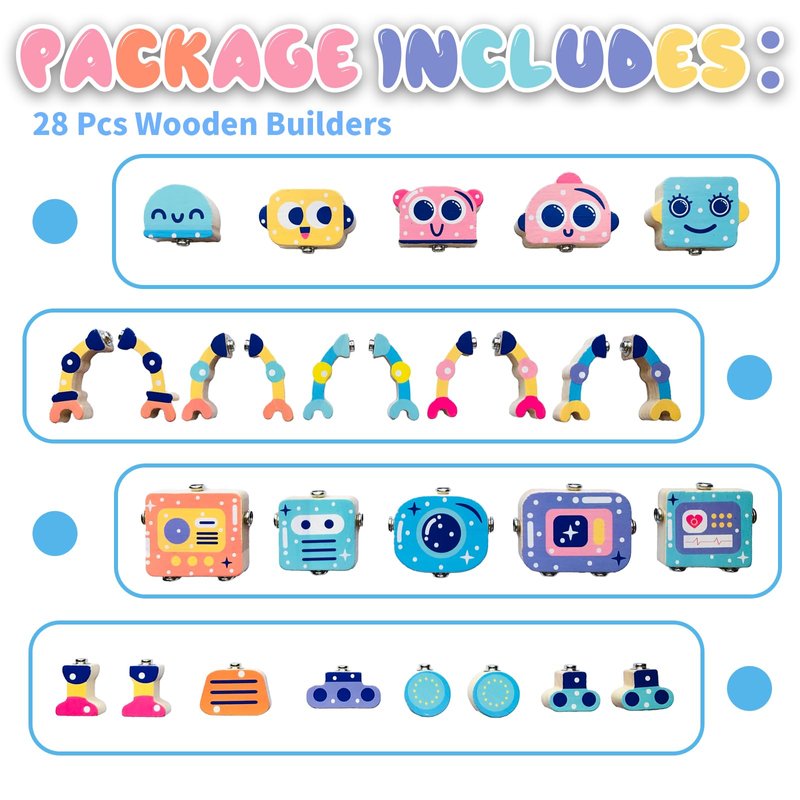 - Creativity Kids Toys: This STEM toy set contains 28 pieces of wooden blocks. Kids can randomize the head, arms, body, and legs to create cool robots! Completed creations bring a sense of accomplishment.