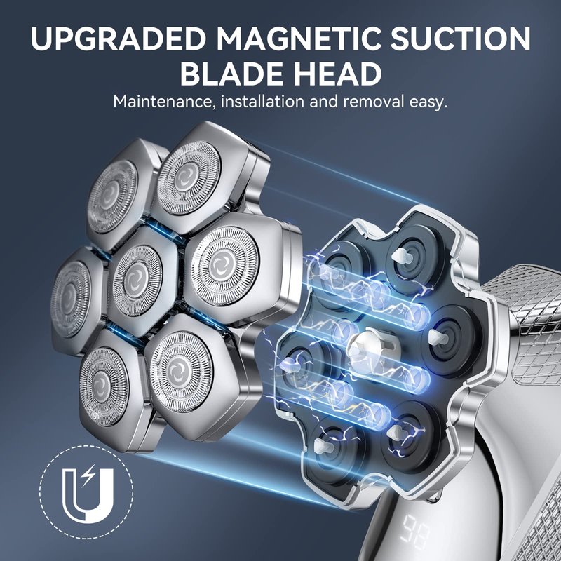 - 【Upgraded Magnetic Suction Blade Head】Maintenance, installation and removal easy. Kensen Upgraded Bald head shavers adopts a magnetic suction structure, only one step to remove and install the integrated blade head. And an additional 7D head shaver replacement blade was added, keep you from worrying about the blade replacement issue.