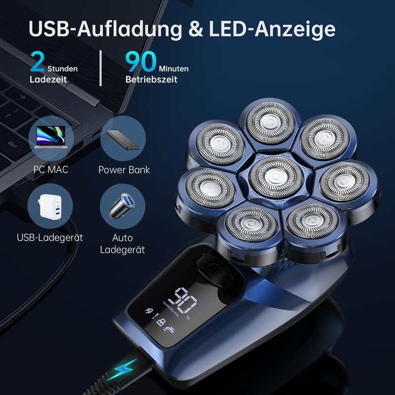 - 【USB Fast Charging & Led Display】Head shavers for men electric razor chargeable just charge 2 hours to enjoy 90 minutes Of shaving time, intelligent led display shows the power, always remind you of the remaining power. When there is no power, bald head shaver can be used when plugged in. Bald head shaving machine for men is durable and sustainable, reducing the burden on the earth and life, and reducing the waste of resources caused by unnecessary replacement and discarding.