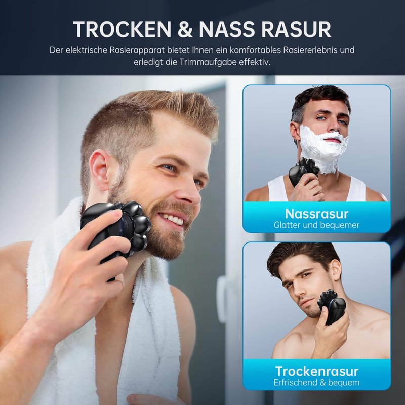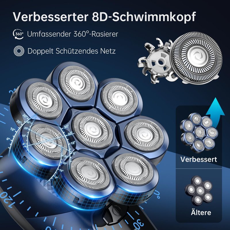 - 【Upgraded 8D Electric Shaver】Our upgraded 8D flexible shaving heads, Silky touch, like a caress, increase the contact area with the head to help you finish shaving faster. Accurately follow your face or head's contour and provide a complete hair removal experience. Speed up shaving of bald head, so that all kinds of hair have nowhere to hide, get up early and go to work without being late, giving you a good mood for the day by using bald head shaver!