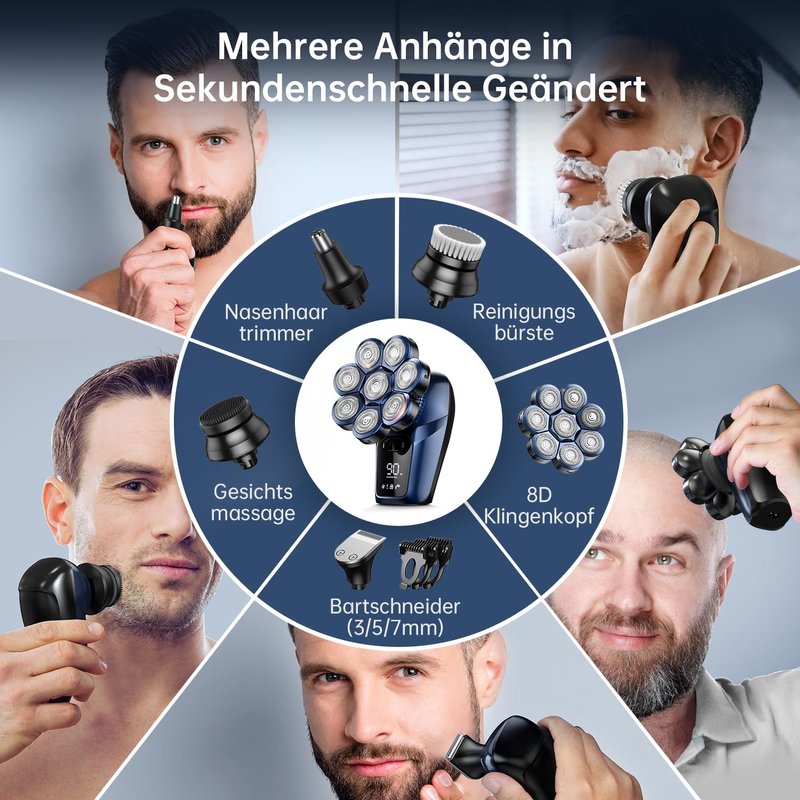 - 【7-in-1 Grooming Kit】The humanized design of the bald head shaver meets the daily needs of most people. Electric Razor For Men Includes 5 Detachable Accessories, Nose/Ear Hair Trimmer, A Rotary Shaving Head, A Hair Clipper (With 3mm/5mm/7mm Guide Comb Trimmer), Plush Facial Cleaning Brush. When you go out neatly, you should follow your heart when you are in any age, Show off your personality and change never ends.