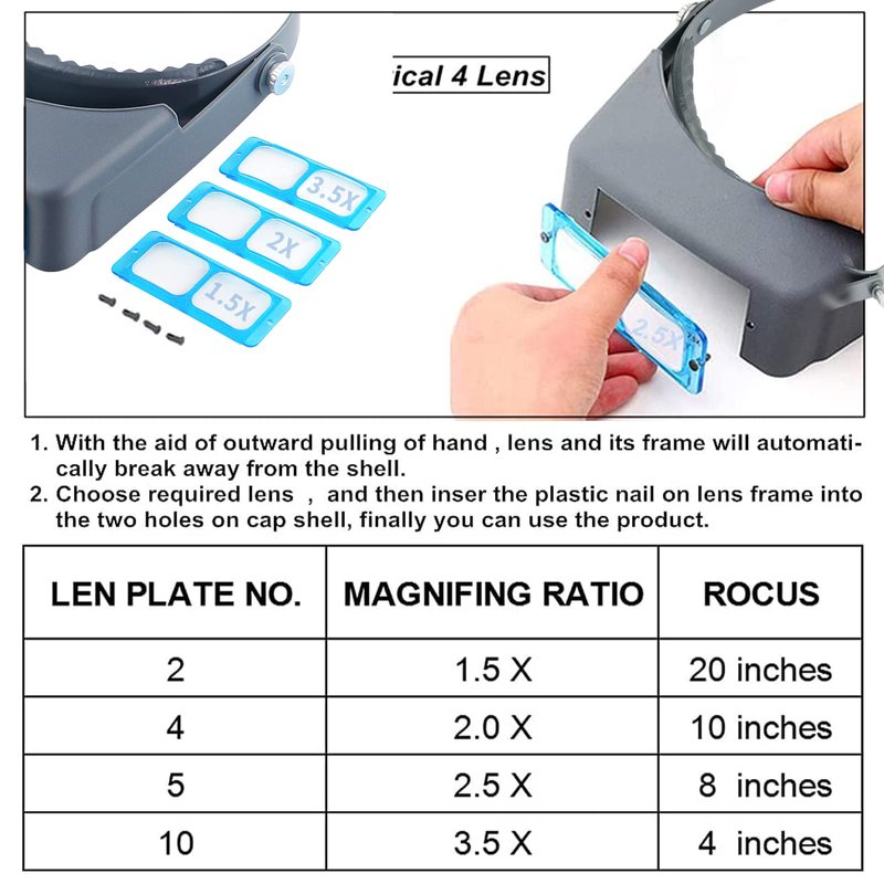 The headband magnifier provides hands free magnification for any number of activities including: artwork, watch-repair, jewelry making, needlework, electronic inspection, book reading, stamp collecting, and print inspection