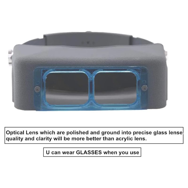 The headband magnifier contains optical glass lenses which are polished and ground into precise prismatic lenses for quality and clarity. Through the glass optical lenses, objects are enhanced, and the overall resolution is increased. Lenses are interchangeable, available in multiple strengths, and attached to a durable plastic frame which moves easily up and down, and locks into place as needed.