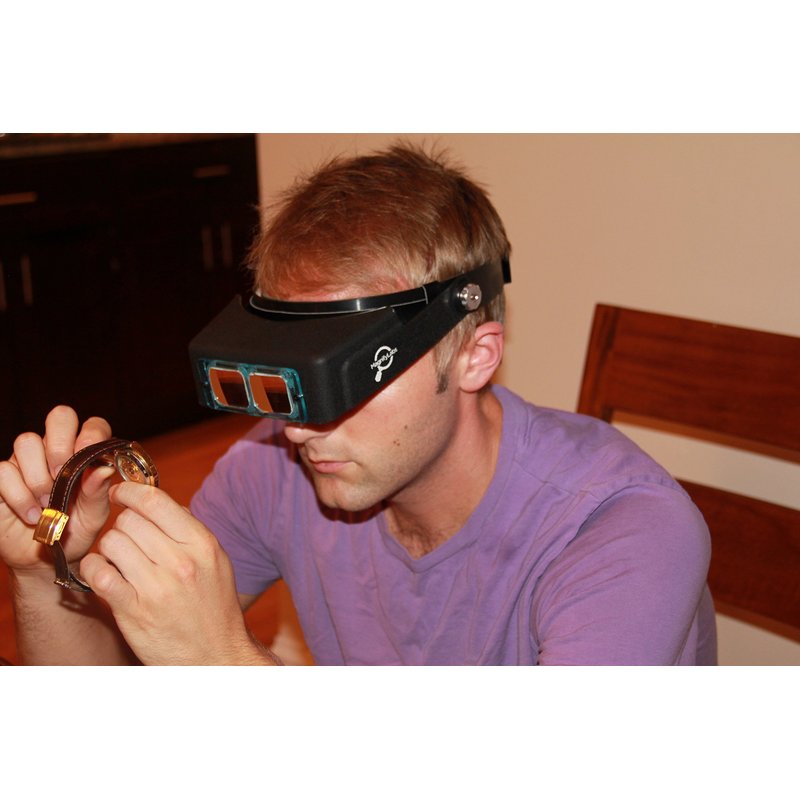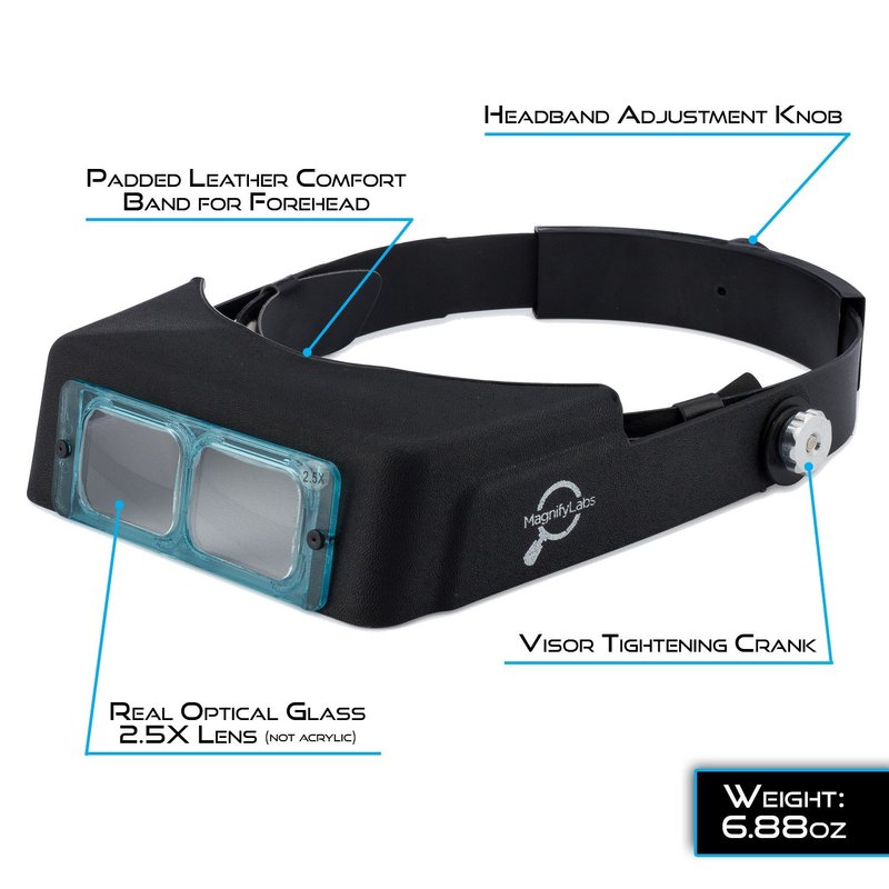 HANDS FREE MAGNIFICATION! The MagnifyLabs Headband Magnifier is a hands free magnification tool which allows for improved efficiency while performing detailed tasks. The magnifier is fitted with high quality optical glass lenses, which are designed to reduce eye strain and boost the wearer's vision. The unit is also designed with an adjustable headband and padded leather strap for maximum comfort and easy manipulation. It can be worn over prescription or safety glasses, and accommodates heads of all sizes and shapes. Great for anyone whose hobby, craft, or occupation requires precise focus. FEATURES. Real Optical Glass vs Acrylic Lenses. The headband magnifier contains optical glass lenses which are polished and ground into precise prismatic lenses for quality and clarity. Through the glass optical lenses, objects are enhanced, and the overall resolution is increased. Lenses are interchangeable, available in multiple strengths, and attached to a durable plastic frame which moves easily up and down, and locks into place as needed. Hands Free Magnification. The headband magnifier provides magnification for any number of activities including: artwork, watch-repair, jewelry making, needlework, electronic inspection, book reading, stamp collecting, and print inspection. Durable, Comfortable, and Adjustable Headband. The headband magnifier is designed for wearer comfort. Both lightweight (about 9 ounces) and durable, the unit comes with a padded leather comfort band. The band can be adjusted to any head size, locked into place, and worn comfortably for hours at a time. The magnifier can also be worn over both prescription and safety glasses. In the Box. Precision Headband Magnifier. Additional Replacement Screws. Inserts for Lenses Product Manual. 4 Glass Lens Plates - 1.5X, 2.0X, 2.5X, and 3.5X. Enhance craftsmanship with our JEWELERS MAGNIFYING GLASS. Designed for MAGNIFYING GLASSES FOR CLOSE WORK, these are ideal JEWELERS GLASSES and JEWELRY GLASSES MAGNIFYING