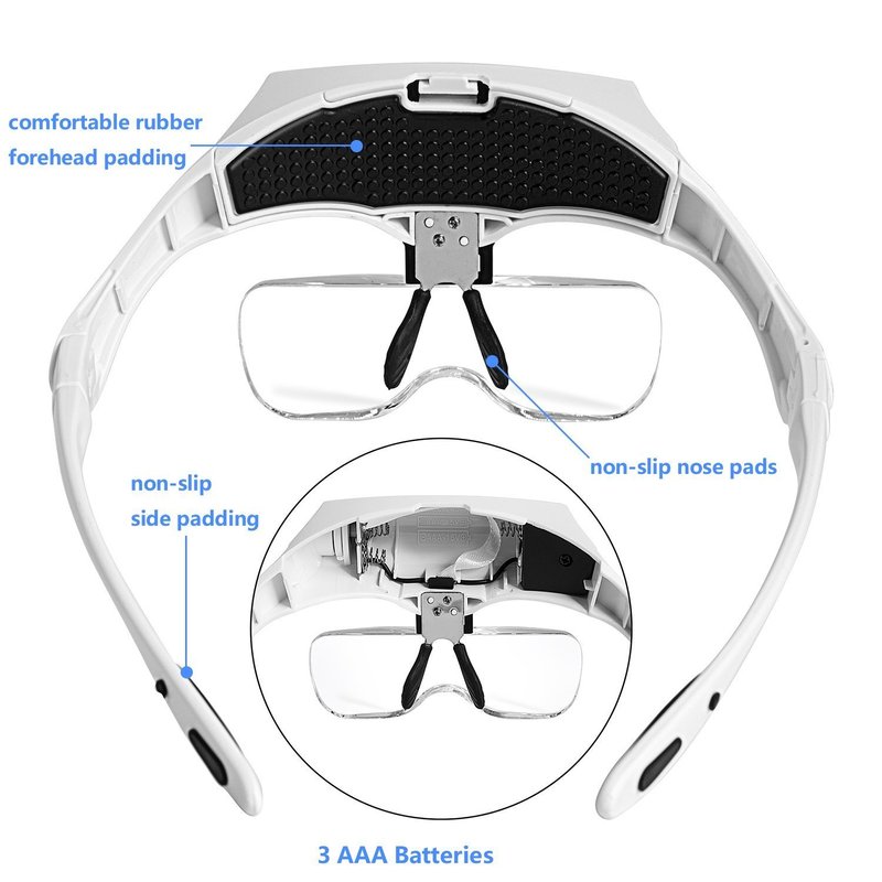 - Magnifier with light has comfortable eyeglass frame with rubber nose-pads or switch to headband for more-secure fit.