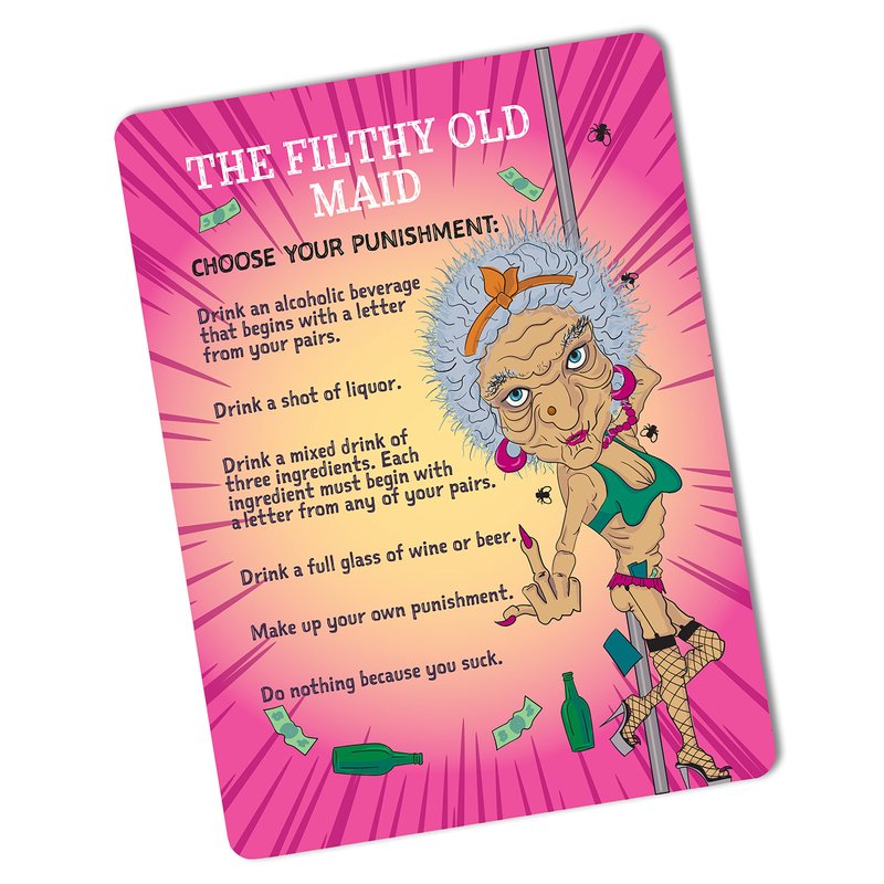 - The player left with the Filthy Old Maid card at the end has to perform a special drinking punishment. Some cards have additional drinking penalties to ratchet up the bad behavior even more!