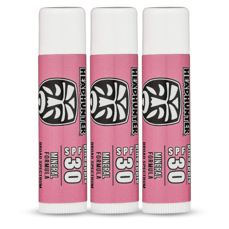 Lean back in your beach chair, paddle out with confidence, and carve the slopes up with our pineapple lip balm sunscreen with broad spectrum SPF 30 solar protection! No matter the season, you've got a sunscreen chapstick you can rely on. Made responsibly with our oceans in mind, Headhunter sunscreen infused chapstick is reef safe and chemical free. Keep your lips hydrated all day long with our zinc oxide sunblock for your lips. Safe for men, women, and children, we implore you to always keep a tube in your back pocket, your car, or your bag. "But what if I leave it in my car overnight and it melts or freezes?"Headhunter sunscreen chapstick covers every nook and cranny of your lips and is water and sweat resistant; not to mention the sweet pineapple flavor! Sunburn tends to creep up on us while we’re out having fun in the sun or snow, but it doesn't have to be that way. Get ahead of the sun's harmful UVA/UVB rays and rely on our natural pineapple lip balm to keep your lips fresh, clean, and hydrated.