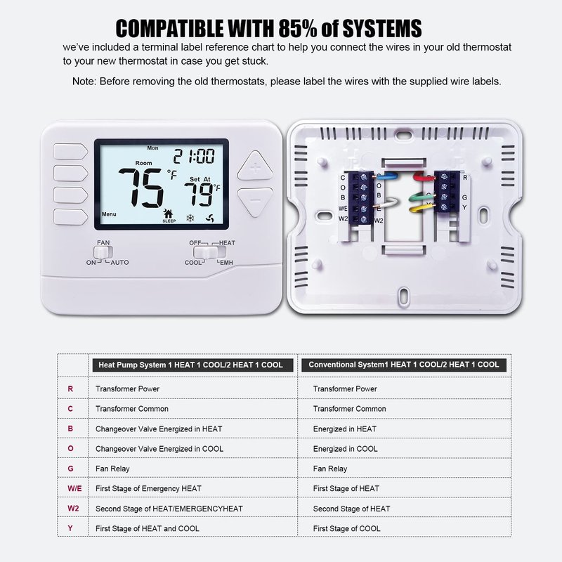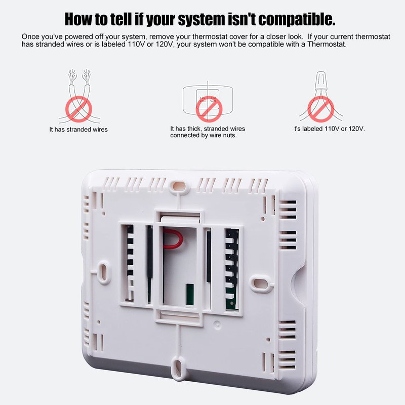 - Not compatible with 110-240V electric heat systems (like electric baseboard heat, line voltage, convectors, radiant-ceiling heat).【2. does not work with conventional multistage systems, mini split systems and 12v rv thermostats.】