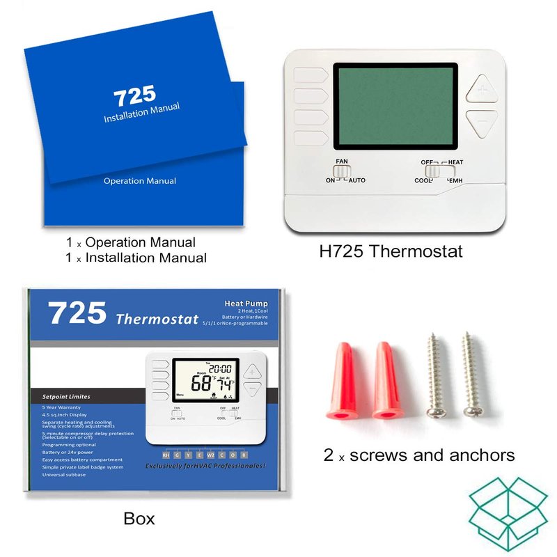 Heagstat H725 is Low Voltage Thermostat, A simple, easy to use 1-week(5-1-1 Day) programmable thermostat. You set it up to adjust the temperature when you are away or asleep-times when you don't necessarily need to heat or cool your home to optimum comfort and your HVAC equipment runs less, savings on annual heating and cooling costs. Plus, your heating or cooling comes back to the comfort level you desire before you come home or wake up, and have 2-year warranty.